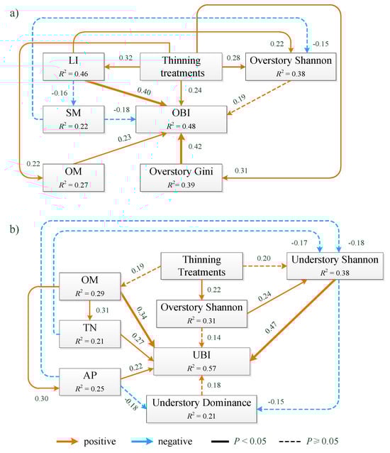 Specially, light intensity, which was directly affected by thinning treatments (standardized path coefficient, b = 0.32, p < 0.05), had a positive and direct effect on overstory biomass increment (b = 0.40, p < 0.05) (Figure 6a). Similarly, soil organic matter (b = 0.23, p < 0.05) and overstory Gini index (b = 0.42, p < 0.05), which were mainly affected by thinning, were positively correlated with overstory biomass increment. Soil moisture and overstory Shannon index had biological information for overstory biomass increment. Furthermore, soil organic matter, TN, and AP were mainly driven by thinning and positively affected (b = 0.22–0.34, p < 0.05) understory biomass increment (Figure 6b), which was consistent with the results of the Mantel tests (Table 6). Among tree diversity factors, the understory Shannon index (b = 0.47, p < 0.05) caused by thinning or environment had the strongest positive effect on understory biomass increment, followed by understory Dominance index and overstory Shannon index.
