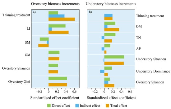 Standardized direct effect, indirect effect, and total effect (direct plus indirect effect) derived from SEM fitted to biomass increments in the overstory (a) and understory (b). The absolute of standardized total effect coefficient greater than 0.3 indicates that this is the key factor affecting biomass increment. Abbreviations: LI, light intensity; SM, soil moisture; OM, soil organic matter; TN, total nitrogen; AP, available phosphorus.