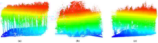 To effectively highlight the strengths of the proposed methods in small tree detection and high-density forest segmentation, as well as to assess the performance of ITS methods across various types of plots, we also used the TLS point cloud data provided by Weiser et al. []. The data are located in the mixed Central European forest lands of Bretten and Karlsruhe near Baden-Württemberg, Germany. The TLS point cloud data were collected by mounting a RIEGL VZ-400 unit on a tripod, which scanned selected tree areas using the multi-scan approach with five to eight scanning positions. The device offers a measurement accuracy of 5 mm and a point cloud density of 7000 points per cubic meter at a scanning range of 100 m. The sensor operates with a pulse repetition frequency of 300 kHz and an angular step width of 0.017 degrees in both vertical and horizontal directions. At some positions, an additional scan was performed using a tilt mount to capture the top of the trees at proximity. Figure 2a shows the TLS point cloud data of Plot BR01 collected on 3 July 2019. Figure 2b shows the TLS point cloud data of Plot BR03 collected on 4 June 2019. Figure 2c shows the TLS point cloud data of Plot BR05 collected on 17 July 2019. Detailed information on the three experimental plots is presented in Table 1.