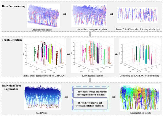 Figure 3 shows the flowchart of the proposed framework. It contains three main steps: data preprocessing, trunk detection, and ITS. First, the raw point cloud data were preprocessed to generate a normalized non-ground point cloud, and the spatial elevation section method was used to obtain the specific height layer slices of the trunk. Then, the KNN algorithm was used to solve the missing segmentation and misrecognition problems that occur when using DBSCAN to detect tree trunks, and the RANSAC cylinder fitting algorithm was utilized to correct the results of trunk detection. Finally, we computed the centroid of the detected trunk point cloud as the seed point. Three seed-based ITS methods (Seeds + Dalponte-2016, Seeds + Li-2012, Seeds + Tao-2015) were compared with the direct application of these three ITS methods [,,]. These are described in more detail below.
