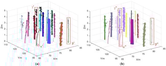 Due to the shading effect of understory shadows and the obstruction of lower-level vegetation, the point cloud data of small tree trunks typically exhibit low-density characteristics. At the same time, the point cloud of the trunk far from the center of the scanning device may be relatively sparse, and there may even be discontinuities in the point cloud of the trunk surface. Moreover, the clustering outcomes of DBSCAN are significantly influenced by the compactness of the sample distribution, posing a challenge in the selection of Eps and MinPts parameters. Especially in complex forest environments, determining the optimal parameters becomes more difficult, and inappropriate parameter settings can greatly reduce the accuracy of trunk detection. In Figure 5a, the small tree labeled as α′ was over-segmented into multiple stem segments due to insufficient point cloud density and was subsequently eliminated during the point-cluster filtering stage. The small tree labeled as β′ was over-segmented due to the low density of the top trunk point cloud. For certain tree trunks whose surface point clouds may exhibit discontinuities due to understory shading and occlusion, DBSCAN may erroneously segment them into multiple stem segments, leading to their removal during the point-cluster filtering stage and consequently resulting in the omission of these trunks (γ′). On the other hand, if these clusters of points segmented into multiple stem segments are not filtered out during the threshold screening stage, then this in turn increases the over-segmentation error when detecting trunks.
