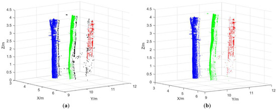 Trunk detection results under insufficient point cloud scanning, colored for core trunks, black for other points. (a) Detecting results using DBSCAN and (b) results after reclassification of the non-core clustered point cloud using the KNN algorithm.