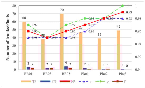 Figure 7 demonstrates the results of trunk detection and its accuracy for the six plots of the proposed method. TP indicates that trunks were correctly detected; FN indicates that multiple trunks were actually present, but only one was identified; FP indicates that they were not actually present, but incorrectly identified as trunks. “r” is the trunk detection rate, which is the ratio of detected to real trunks; “p” is the correct rate of detected trunks; and F is the weighted mean calculated by combining r and p. In the trunk detection across six plots, r ranged from 94.6% to 98.0%, with a total r of 95.9%; p ranged from 95.0% to 100%, with a total p of 97.4%; and F ranged from 0.95 to 0.99, with a total F of 0.97. The r, p, and F values for the three plots selected from Chinese planted forests (Plot1, Plot2, and Plot3) were higher than those for the three sample plots selected from German natural forests (BR01, BR03, and BR05), indicating that planted forests have better r, p, and F values than natural forests. Among the six plots, the total FN for the three sample plots selected from the German natural forest (BR01, BR03, and BR05) was nine, while the total FN for the three sample plots selected from the Chinese planted forests (Plot1, Plot2, and Plot3) was three. In addition, it is noteworthy that the total number of FP is lower than the number of FN.