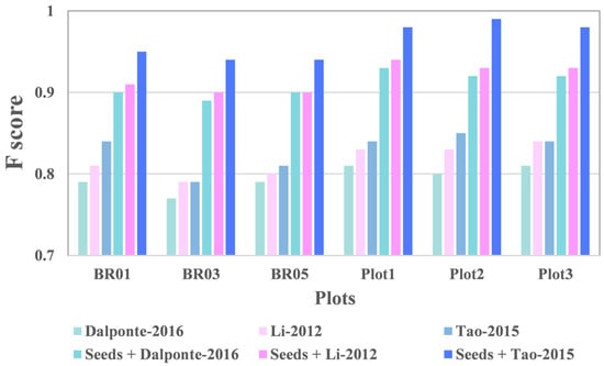 The overall segmentation accuracy of the three seed-point-based ITS methods (Seeds + Dalponte-2016, Seeds + Li-2012, Seeds + Tao-2015) was significantly better than that of directly using these three methods (Figure 8 and Table 4). All three seed-point-based ITS methods had stable F scores on the six plots (Figure 8), with the highest segmentation accuracy being achieved by the method of Seeds + Tao-2015, which correctly segmented 298 out of 316 trees, with total r, p, and F of 95.2%, 97.4% and 0.96, respectively (Table 4). In contrast, the three ITDS methods without seed points had lower overall accuracy (Figure 8 and Table 4). Compared to Dalponte-2016 and Li-2012, the Tao-2015 method performed slightly better, correctly segmenting 261 out of 316 trees, with an overall r, p, and F of 86.7%, 78.8%, and 0.83, respectively (Table 4).