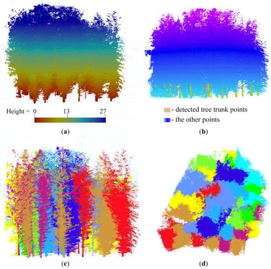Individual tree segmentation (ITS) results in high-canopy-density forests. (a) The Original point clouds of BR03 plot, (b) trunk detection results, (c) side view of ITS results, where detected trees are randomly colored and the same color represents one tree, (d) top view of ITS results.