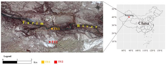 The Tarim River, located in northwestern China, stretches for a total length of 2137 km, making it the longest inland river in China []. The sampling site for this study is situated in the Yingsu section of the lower Tarim River. The study area experiences an arid climate with high evaporation rates, and the average annual precipitation ranges from 17–42 mm, characteristic of a typical warm temperate desert arid zone []. The main tree and shrub species include Populus euphratica and multi-branched tamarisk (Tamarix ramosissima Ledeb), while herbaceous plants include reed (Phragmites australias Trin) and camel thorn (Alhagi spaysifolia Shap) []. To highlight the effect of different groundwater levels on xylem conductance parameters, the sampling sites for this study were chosen from TY1, located close to the river, and TY2, located further away from the river. The exact locations of the sampling points are shown in Figure 1.