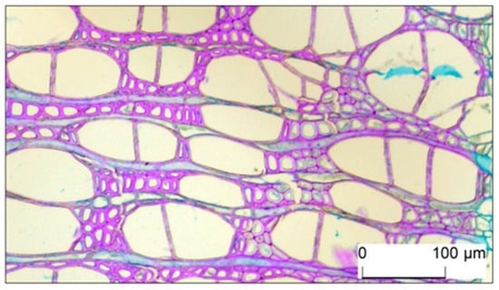 After removing the samples from the FAA solution, they were scored in the vertical direction of the vascular tubes before being placed in the embedding box and dehydrated in low-concentration ethanol solutions (30% ethanol, 50% ethanol, 70% ethanol, 85% ethanol) for 90 min and high-concentration ethanol solutions (95% ethanol, 100% ethanol I, 100% ethanol II) for 60 min, respectively. This process replaces plant tissues with water, and the samples were then embedded after steps such as limonene transparency and wax dipping. A rotary slicer (LEICA RM2255, Wetzlar, Germany) was utilized to cut the samples into 8 μm slices, and the paraffin slices were fixed on slides after the process of spreading and fishing. The sections were then dried, dehydrated, stained and washed, following specific steps for sample processing as outlined in the exploration of the method of paraffin sectioning of microtubercoles []. After staining, the sections were sealed with neutral gum and photographed under a 100× microscope for observation (Figure 2). As sampling was conducted using a fixed-point continuous method, all xylem anatomical parameters were measured using cumulative parameter values, meaning each measurement was cumulative from the previous annual cycle. Image-ProPlus 6.0 was utilized to measure the main indicators of xylem parameters, such as number, density, average/total area and maximum/minimum area of xylem ducts of Populus euphratica. The indoor processing procedure for the samples is detailed in Figure S1.