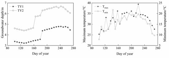 The depth of groundwater and the maximum and minimum temperatures at the sampling sites during the growing season of Populus euphratica in 2020 are depicted in Figure 3. At sampling site TY1, the groundwater depth varied from 3.22 to 4.79 m, with an average value of 4.01 m. Meanwhile, at sampling site TY2, the groundwater depth ranged from 4.41 to 6.68 m, with an average value of 5.67 m. Overall, the depth of groundwater at sampling site TY1 was shallower than that at sampling site TY2. Moreover, the trend of changes in groundwater depth over time during the poplar season was consistent, with a shallower depth in the early part of the season compared to the late part. During the growing season of Populus euphratica in 2020, the fluctuations in maximum air temperature at the sampling sites ranged from 25.3 to 39.38 °C, with an average of 32.5 °C. Additionally, the variations in minimum air temperature at the sampling sites ranged from 7.88 to 21.71 °C, with an average of 15.8 °C. Overall, the changes in maximum and minimum temperatures over time exhibited a pattern of initially increasing and then decreasing.