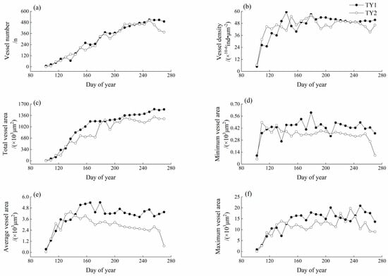 The environment affects the function and structure of trees by influencing their physiological processes and, thus, xylem formation. In response, trees can adjust their physiology to adapt to environmental changes [,]. In this study, the total vessel area of TY1, with a higher groundwater level, was generally larger than that of TY2, which had a lower groundwater level. This is because TY1 is closer to the river, resulting in a higher groundwater level and better water conditions. The relatively sufficient water supply increases the cell expansion rate and turgor pressure [], leading to a larger total vessel area in TY1 compared to TY2. Additionally, it was observed that after DOY242, the number of vessels stopped increasing. This may be due to the cessation of cell division in the formation layer before the end of the growing season, allowing enough time for the cells that have completed division to differentiate and mature []. The present study showed that all parameters of xylem conduits are higher in TY1, which has a higher water table, compared to TY2, with a lower water table during the growing season. It is generally believed that favorable water conditions promote xylem cell growth. Since TY1 is closer to the river and has a higher water table, the better water supply conditions directly or indirectly affected xylem growth. Consequently, all parameters of xylem anatomy were higher in TY1 than in TY2, which is consistent with the conclusions of other studies [,].