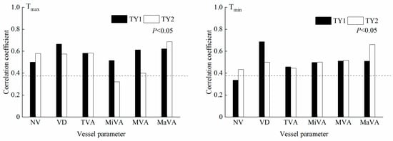 The growth process of trees is an adaptation to environmental changes, and many studies have shown that trees respond and adapt to these changes [,]. It has been shown that temperature affects characteristics of xylem conduits by influencing the physiological processes in trees []. Xylem layer activity begins when the ambient temperature exceeds the minimum threshold temperature for xylem activity, and changes in temperature also affect the length of the growing season []. Higher temperatures early in the growing season increase the number and size of xylem vessels, thereby improving water conduction capacity []. In this study, we found varying degrees of positive correlations between xylem conduit characteristics and air temperature in the two sample plots, indicating that increased temperature is favorable for xylem growth. This finding aligns with the results obtained by Zheng in their study of water hyacinth in northeast China []. The present study area, located in the Tarim River region, differs from northeast China in terms of altitude, soil fertility and climatic conditions, which may account for some differences in findings. However, temperature does influence the growth rates of the phloem cells by affecting cell division, which in turn impacts xylem growth. It has also been shown that in arid regions, moisture is the main limiting factor for tree growth [], with significant correlations between vascular area and precipitation in xylem anatomy [], while the correlation with temperature is not significant []. In this study, vascular density, total vessel area, mean vascular area and maximum vessel area of xylem in the two sampling points were found to be significantly positively correlated with maximum and minimum temperatures. The difference from previous research findings may be due to the study area being located in an arid area but near the riverbank, which provides relatively good moisture conditions. Additionally, the temperature conditions in this area are well-suited for the growth of Populus euphratica, facilitating an increased photosynthetic rate and the growth of xylem cells, thereby positively effecting the characteristics of the xylem vessels. A comparison of the correlations between xylem parameters and maximum and minimum temperatures at TY1 and TY2 showed that both sites exhibited a stronger correlation with maximum temperature than with minimum temperature. This suggests that maximum temperature has a greater impact on the growth of Populus euphratica during the growing season. Yuan [] indicated that minimum temperature is more restrictive for the radial growth of red pine. However, the primary limiting factor for Populus euphratica growth is moisture []. As temperature increases, evaporation at the sampling site intensifies, accelerating soil moisture loss and reducing the water available for Populus euphratica growth, which subsequently affects its growth.