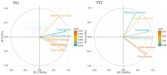 Principal component analysis of the xylem anatomical parameters of Populus euphratica under different water table conditions (Figure 6) revealed that sample site TY1, characterized by a higher water table depth and better moisture conditions, exhibited a first principal component and second principal component, explaining a total of 91.80% of the variance, with the first principal component accounting for 76.8% and the second principal component for 15%. This indicates that the xylem conduit parameters of Populus euphratica play a more central in responding to the growth environment under relatively favorable moisture conditions. The first principal component contains information about maximum conduit area (0.97) and total conduit area (0.93), while the second principal component contains information about minimum conduit area (0.70) and number of conduits (−0.45). Sample site TY2 had a lower groundwater burial depth and poorer moisture conditions, with the first principal component and second principal component explaining a total of 86.46% of the variance. The first principal component accounted for 54.83%, and the second principal component accounted for 31.62%. This suggests that the response of the xylem conduit parameters of Populus euphratica to the growth environment is also more concentrated under relatively poor moisture conditions. Among them, the first principal component contained the information about maximum conduit area (0.91) and conduit density (0.87), while the second principal component contained information about minimum conduit area (0.80) and average conduit area (0.72). Detailed data from the principal component analysis are in Tables S1 and S2.