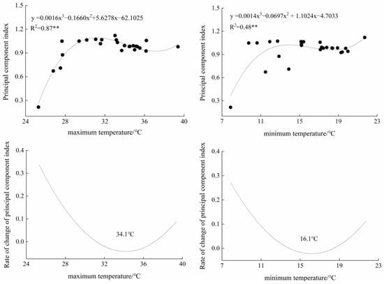 The TY1 xylem anatomical parameter indices were fitted to maximum and minimum air temperatures as a function of temperature (Figure 7), and the fitted equations passed the 99% significance test. From the above analyses, it can be observed that the xylem principal component parameter indices changed with the maximum and minimum air temperatures in a basically consistent trend, both increasing significantly with the rise in air temperature. However, once the air temperature reached a certain value, the change in xylem principal component parameter indices became minimal. The sensitivity analysis of the fitted polynomial function revealed that the sensitive maximum temperature for the change of xylem principal component parameter index of Populus euphratica was 34.1 °C, and the sensitive minimum temperature was 16.1 °C.