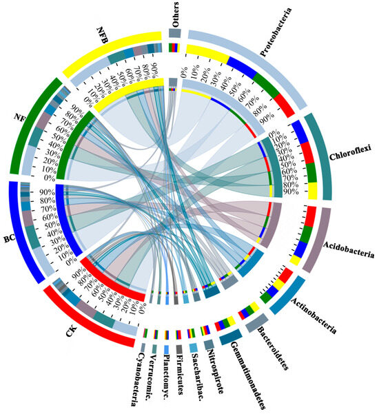 Relative abundance and community composition of dominant bacterial phyla in soils for each treatment and the control. Treatment types include the control (CK, no biochar and no 15N-labeled fertilizer), BC (20 t hm−2 biochar), NF (8 g plant−1 15N-labeled fertilizer), and NFB (20.0 t hm−2 biochar plus 8.0 g plant−15N-labeled fertilizer). Saccharibac.: Saccharibacteria; Planctomyc.: Planctomycetes; Verrucomic.: Verrucomicrobia.