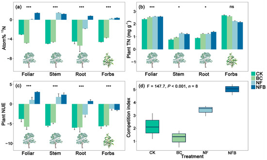 NF and NFB significantly (p < 0.001) increased the competition ratios of eucalypt to forbs for acquiring N relative to the control, whereas no significance was observed in BC (Figure 2d). In addition, the effects of NFB on the competition ratios were significantly (p < 0.001) 4.11 times higher than that of NF.