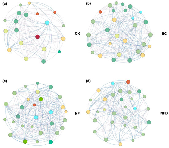 Co-occurrence networks of microbe (CK: (a); BC: (b); NF: (c); NFC: (d)). The size of the connection points is proportional to the number of links. The line represents significant correlations with the absolute value of Spearman (r > 0.5, p < 0.05).