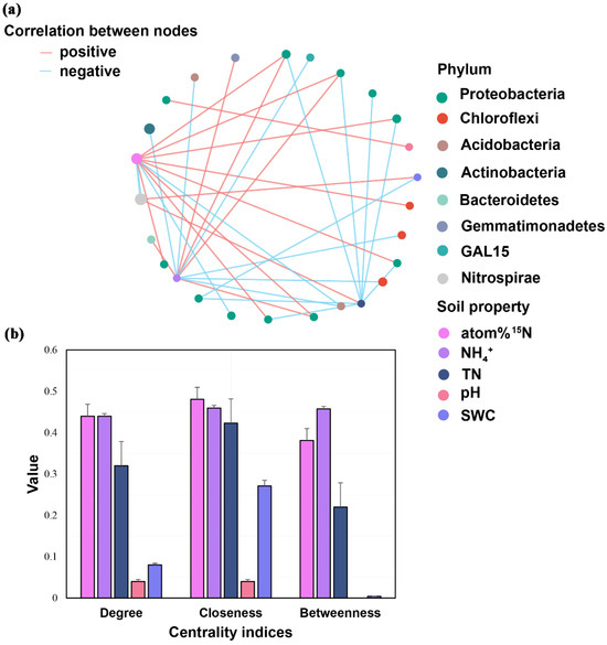 The correlations between the relative abundance of putative keystone taxa and soil properties were conducted (Figure 4a), and 16 positive and 17 negative correlations were observed. Interestingly, four keystone taxa assigned to Proteobacteria (1 and 3, respectively) under all treatments and the control were significantly and positively correlated with soil pH and NH4+, whereas eight keystone taxa assigned to Proteobacteria (1 and 7, respectively) negatively correlated with SWC and soil TN. Moreover, one keystone taxa assigned to Chloroflexi were significantly and positively correlated with soil 15N atom %, whereas two keystone taxa assigned to Chloroflexi negatively correlated with soil NH4+. One keystone taxa assigned to Gemmatimonadetes and Bacteroidetes, respectively, were significantly and positively correlated with soil NH4+, whereas two keystone taxa assigned to Acidobacteria and one keystone taxa assigned to Actinobacteria showed a negative correlation with soil NH4+. The Centrality Coefficient indices indicated that the correlations between soil atom 15N, soil NH4+, and putative keystone taxa in the network were higher than those in soil TN, pH, and SWC (Figure 4b).