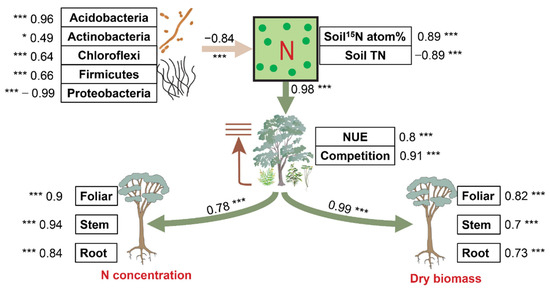 Variations in soil 15N atom % were negatively and directly influenced by the majority of soil putative keystone taxa in our study. It suggests that the growth and reproduction of soil bacterial taxa utilize soil available N and leads to a competition between soil microbes and plant N use and competition [52]. This pattern was certified by the indirect and negative correlation between soil putative keystone taxa and plant N use and competition (Figure 5). Moreover, the positive and direct correlations between soil 15N atom % and plant NUE competition index indicate that N fertilizer application could contribute greatly to the eucalypt N accumulation. The positive and direct correlations between plant NUE, competition index, plant N concentration, and dry biomass indicate that the growth and nutrient accumulation of eucalypt is more influenced by plant NUE and N competition between target crops and undesirable plants [31] than physicochemical properties of soil [27] and soil microbial diversity [26].