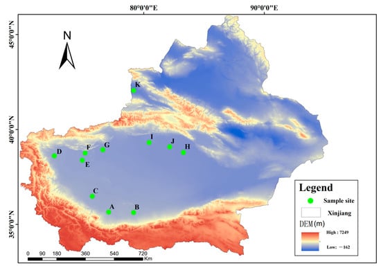 Eleven representative natural P. pruinosa forest sampling sites in Xinjiang, China, were selected for this study, and their latitudes and longitudes were in the ranges of 36.9291°–43.8444° N and 76.1722°–85.4831° E, respectively (Figure 1). The groundwater depth (GD) ranged from 3.4 to 7.9 m. The mean annual temperature (MAT) varied from 9.73 °C to 12.67 °C, and the mean annual precipitation (MAP) ranged from 28 to 217 mm. The altitude spanned from 543 m to 1400 m. The aridity index (AI) refers to the ratio of the MAP to the potential evapotranspiration [34]. All the sampling sites had AI values between 0.0184 and 0.1432 (Table 1). More climatic information of the sampling sites can be found in Supplementary Table S1. The common species in the study area included Tamarix chinensis Lour. (Tamaricaceae), Phragmites australis (Cav.) Trin. ex Steud. (Poaceae), Lycium ruthenicum Murr. (Solanaceae), Halimodendron halodendron (Pall.) Voss (Fabaceae), and Sophora alopecuroides L. (Fabaceae).