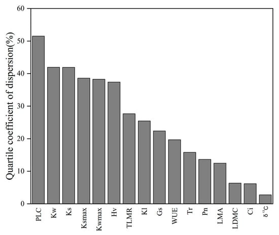 QCDs of functional traits across all measurements in the study (n = 220). Traits are ordered from highest to lowest (left to right). PLC: percent loss of hydraulic conductivity, Kw: wood-specific conductivity, Ks: sapwood-specific conductivity, Ksmax: maximum sapwood-specific conductivity, Kwmax: maximum wood-specific conductivity, Hv: Huber value, TLMR: branch–leaf mass ratio, Kl: leaf-specific conductivity, Gs: stomatal conductance, WUE: water-use efficiency, Tr: transpiration rate, Pn: net photosynthetic rate, LMA: leaf mass per area, LDMC: leaf dry matter content, Ci: intercellular carbon dioxide concentration, and δ13C: carbon isotope signature.