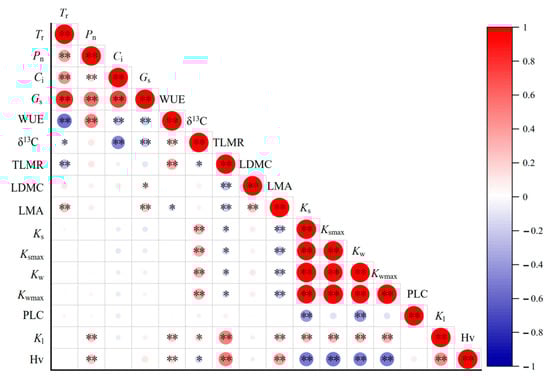 Pearson’s correlation analysis of functional traits (p < 0.05: *; p < 0.01: **; n = 220). The scale on the right represents the strength of the correlation. PLC: percent loss of hydraulic conductivity, Kw: wood-specific conductivity, Ks: sapwood-specific conductivity, Ksmax: maximum sapwood-specific conductivity, Kwmax: maximum wood-specific conductivity, Hv: Huber value, TLMR: branch–leaf mass ratio, Kl: leaf-specific conductivity, Gs: stomatal conductance, WUE: water-use efficiency, Tr: transpiration rate, Pn: net photosynthetic rate, LMA: leaf mass per area, LDMC: leaf dry matter content, Ci: intercellular carbon dioxide concentration, and δ13C: carbon isotope signature.