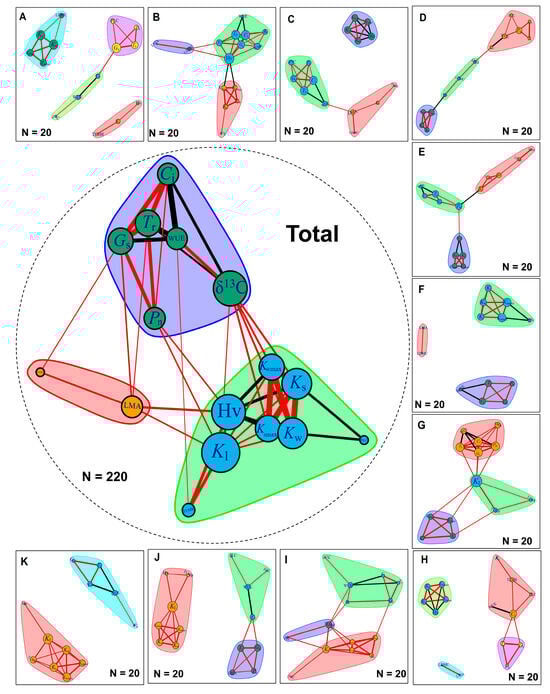 PTNs of 11 populations. The subfigures (A–K) represent the PTNs of different populations. Traits sharing the same background color belong to the same module. The size of the circle around a trait denotes its importance in the network. Lines represent associations between and within modules, with the line thickness reflecting the correlation strength. Red and black lines indicate positive and negative correlations, respectively. Traits without a correlation with others were omitted from the network. Based on the distance between two nodes, the independence and cooperation between traits were evaluated. PLC: percent loss of hydraulic conductivity, Kw: wood-specific conductivity, Ks: sapwood-specific conductivity, Ksmax: maximum sapwood-specific conductivity, Kwmax: maximum wood-specific conductivity, Hv: Huber value, TLMR: branch–leaf mass ratio, Kl: leaf-specific conductivity, Gs: stomatal conductance, WUE: water-use efficiency, Tr: transpiration rate, Pn: net photosynthetic rate, LMA: leaf mass per area, LDMC: leaf dry matter content, Ci: intercellular carbon dioxide concentration, and δ13C: carbon isotope signature.