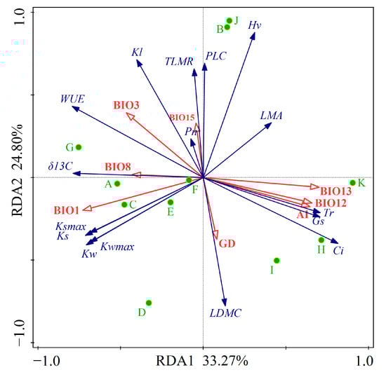 RDA of functional traits and seven important environmental factors (n = 11). Green dots represent different sites, blue arrows denote functional traits, and red arrows indicate climate factors. PLC: percent loss of hydraulic conductivity, Kw: wood-specific conductivity, Ks: sapwood-specific conductivity, Ksmax: maximum sapwood-specific conductivity, Kwmax: maximum wood-specific conductivity, Hv: Huber value, TLMR: branch–leaf mass ratio, Kl: leaf-specific conductivity, Gs: stomatal conductance, WUE: water-use efficiency, Tr: transpiration rate, Pn: net photosynthetic rate, LMA: leaf mass per area, LDMC: leaf dry matter content, Ci: intercellular carbon dioxide concentration, and δ13C: carbon isotope signature. BIO1: annual average temperature, BIO3: isothermality, BIO8: average temperature of the wettest quarter, BIO12: annual precipitation, BIO13: precipitation in the wettest month, BIO15: seasonal variation of precipitation, AI: aridity index, GD: groundwater depth.