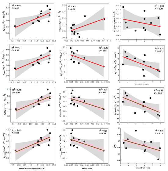 Relationship between the functional traits and important environmental factors (n = 11). The shaded area represents the 95% confidence interval, and the red line indicates the linear regression fitting line. Kw: wood-specific conductivity, Ks: sapwood-specific conductivity, Ksmax: maximum sapwood-specific conductivity, Kwmax: maximum wood-specific conductivity, Kl: leaf-specific conductivity, Gs: stomatal conductance, Pn: net photosynthetic rate, and δ13C: carbon isotope signature.