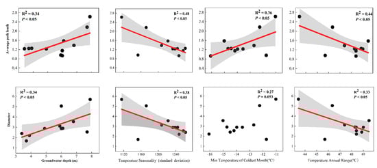 The network’s overall parameters were significantly correlated with some temperature-related climate factors and groundwater depth (Figure 8). Specifically, a significant negative correlation was identified between the network’s diameter and average path length and the seasonal temperature variation coefficient and annual temperature range (p < 0.05). In addition, the lowest temperature of the coldest month and groundwater depth showed a significantly positive correlation with the average path length (p < 0.05).