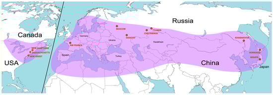 - Several time series of area S of seasonal pest damage in a small area. These time series were analyzed for such territories as the states of Massachusetts, New Hampshire, and New Jersey in the USA [], data on area S of damaged forests in the Tyumen region (Russia) and in Japan (prefectures Hokkaido and Niigata), and data on the average level P of damage to tree crowns on test plots in the northwestern part of France (46.00–49.00° N, 0–1.00° E). Spongy moth habitat and observation points are shown in Figure 1.