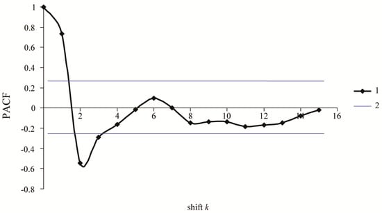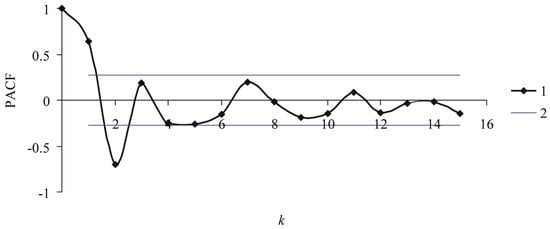 Thus, to build model 2 (see Equation (2)), it is necessary to estimate the order of autoregression k and the values and signs of coefficients in Equation (2). The order of autoregression in the system and the delay in the set of feedback loops were estimated by means of the PACF. The order of autoregression in the system was estimated using the order of a maximally significant PACF [].