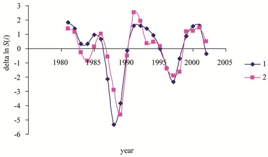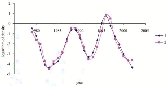 Time series of log-transformed population monitoring data (curve 1) and of model data (curve 2).
