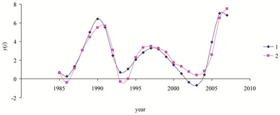 As an illustration of the proposed procedure, Figure 6 shows a time series of log-transformed data and a time series of model data about spongy moth population density dynamics in the Khabarovsk region.