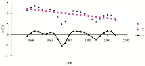 Dynamics of area S(i) affected by spongy moth outbreaks in Massachusetts in year T (Curve 1). Curve 1: log-transformed data from real-world monitoring of ln S(T). Curve 2: the trend SS(T) = 431.65 − 0.212T of ln S(t). Curve 3: detrended time series DSS(T) = ln S(T) − SS(T).