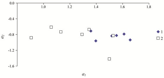 Figure 11 indicates that in the {a1, a2} plane, the positions of clusters differ between the population dynamics model and the damage area dynamics model. Nevertheless, according to the t test, there are no significant differences (p ≥ 0.05) between mean values <a2> = from population dynamics models and mean values <a2> = from damage area dynamics models. By contrast, according to the t test, there are significant differences (p < 0.05) between means <a1> = from population density dynamics models and means <a1> = from damage area dynamics models.