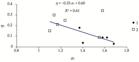 The relation between coefficient a1 and stability margin η for population density dynamics models (1) and damage area dynamics models (2).