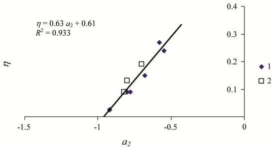 The relation between coefficient a2 and stability margin η for population density dynamics models (1) and damage area dynamics models (2).