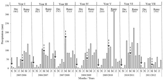 Monthly and total precipitation during the rainy and dry seasons over seven years. Arrows with full rows indicate the period of sample collection at the end of the rainy seasons, and arrows with dashed lines indicate the period of sample collection at the end of the dry seasons. Data were provided by the meteorological station in Empresa Pernambucana de Pesquisa Agropecuária (IPA) in Caruaru, Pernambuco, Brazil.