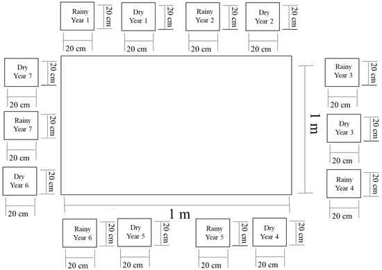 In the fragment of native vegetation studied, there is a 1 ha area where long-term studies have been carried out on local vegetation [5,24,26]. In this section, 1 × 1 m plots were installed randomly to investigate above-ground vegetation [5,26], 35 in each microhabitat (flat, rocky, and ciliary), totaling 105 plots. Soil from each plot was sampled from each microhabitat at the end of the rainy (March) and dry (September) seasons, over seven consecutive years (2006–2012) (Figure 2). The soil was sampled at a 5 cm depth using a 20 × 20 cm collector made from a galvanized sheet separating the litter layer, giving a total of 2940 samples (70 soil samples per year in each microhabitat × seven years × two depths), following the methodology adopted in most studies on soil seed banks [11,19,29].