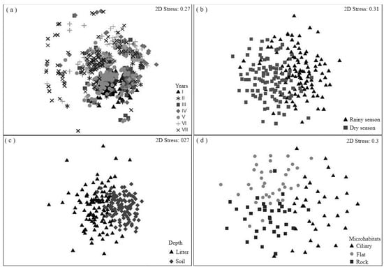 Multidimensional scaling (MDS) analysis of the germinated species in the soil seed bank in a dry forest area (Caatinga) (a) during seven consecutive years, (b) between climatic seasons (Rainy and Dry), (c) between two depths (litter and 0–5 cm soil), and (d) between three microhabitats (Ciliary, Flat, and Rock). The charts were produced based on species richness. Graph symbols represent the soil samples and their respective germinated species, considering the seven years of study.