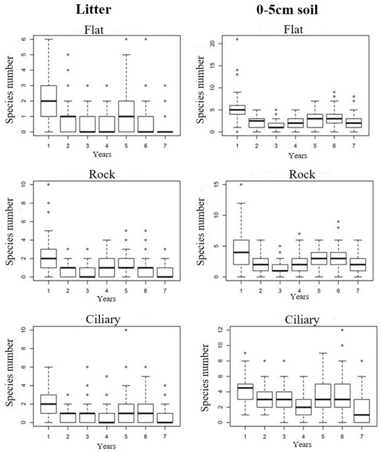 The ANOSIM analysis showed significant spatio-temporal variation in floristic composition. We observed the existence of annual variations (global R = 0.209 and p < 0.01; Figure 3a) and seasonal variations (global R = 0.242 and p < 0.01; Figure 3b) in the species set. The species set recorded in the seventh year of this study was smaller compared to those recorded in the first six years. In the vertical space, the floristic composition of the litter was different from that found in the 0–5 cm soil (global R = 0.35 and p < 0.01; Figure 3c). In the horizontal space, there was also variation in floristic composition among the three microhabitats (global R = 0.311 and p < 0.01; Figure 3d).