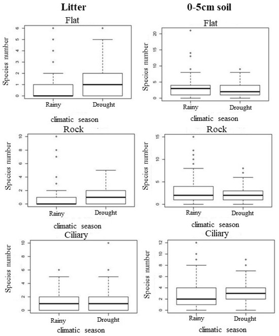 Thirty-five species occurred exclusively during the dry season and 29 occurred exclusively during the rainy season. In the vertical space, 9 and 44 species occurred exclusively in the litter and the soil (0–5 cm), respectively. In the horizontal space, 17 species occurred exclusively in the flat microhabitat, four in the rocky, and 22 in the ciliary (Table S1).