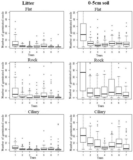Considering the seven years, seedling emergence was higher in the first year, in the two soil depths, and in the three microhabitats (Figure 6). By analyzing the spatial variations individually, it was possible to determine that the soil (0–5 cm) and the rocky microhabitat had the largest number of germinated seeds (Figure 6).