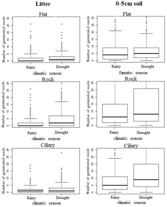 The number of germinated seeds per square meter (sem·m−2) in the three microhabitats (Flat, Rock, and Ciliary) in the two climatic seasons (Rainy and Dry) in the litter and 0–5 cm soil for seven consecutive years in a Caatinga area of northeastern Brazil.