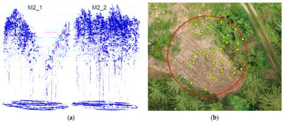 The problem with captured laser data covering circular plot 4 (a). The final felled area (marked with X in Figure 1) of one circular plot covering AOI M1 with field labels portrayed by yellow points (b).