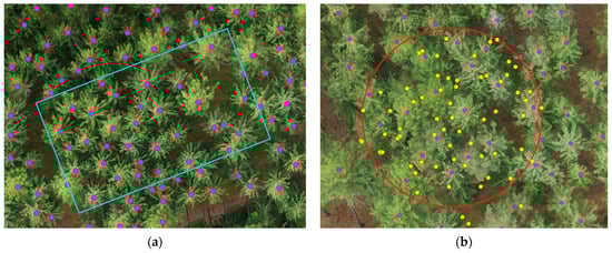 Manual labels (purple dots) identified on top of the RGB orthophoto inside the rectangular plot area (turquoise). (a); Field inventory circular plot (red) with measured trees (yellow dots) and manual labels (b).