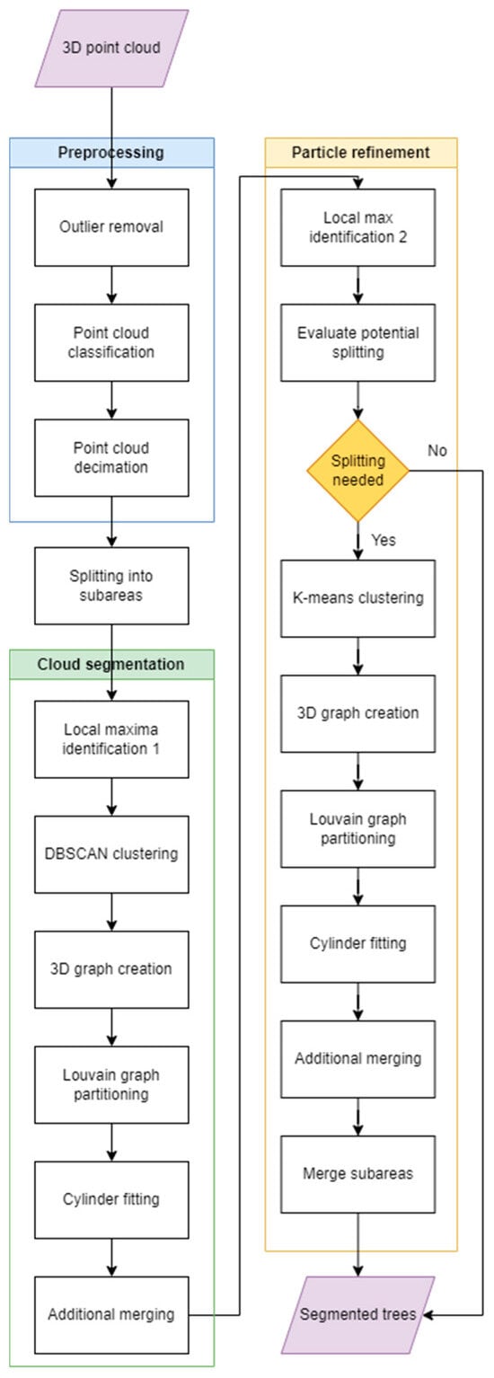 The method used different approaches to segment individual trees. The main parts of the method were based on graph theory and various clustering algorithms. For segmentation, only the spatial properties (x, y, z coordinates) of the point cloud were considered (no usage of point intensity or RGB color). The overall process scheme is presented in Figure 4.