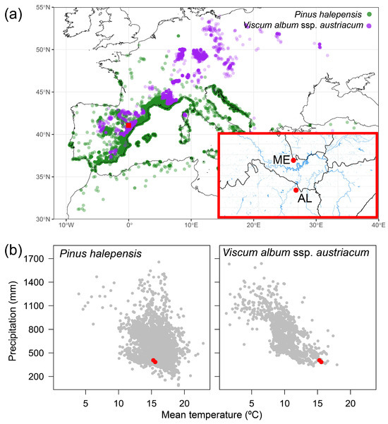 Distribution (a) and climate envelopes (b) of Aleppo pine (Pinus halepensis) and European pine mistletoe (Viscum album ssp. austriacum) on the European scale. In (a) circles indicate species occurrence according to GBIF database, and the red square represents the location of the study region. The bottom right inset indicates the location of Alcañiz (AL) and Mequinenza (ME) study sites; black lines are provincial boundaries and blue lines represent the main watercourses. In (b), the climate variables are mean annual temperature and total annual precipitation averaged over the period 1991–2020 and downloaded from TerraClimate dataset [35]. Grey symbols represent climate at the locations of occurrences of (a), and red symbols represent the study sites.
