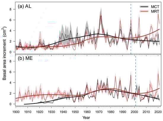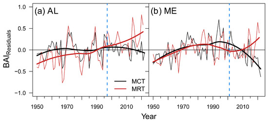 In AL, MRTs grew less than MCTs in the mid-20th century, but after mistletoe removal, BAI trends became slightly positive and negative in MRTs and MCTs, respectively (Figure 2a). In ME, both tree classes showed similar BAI patterns throughout most of the 20th century, but MCT growth trends turned negative during the 21st century, while MRTs showed no trend (Figure 2b). Growth rates of MCTs were lower than those of MRTs a few years after mistletoe removal at both sites.