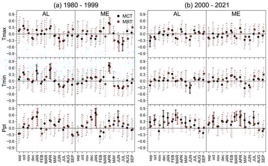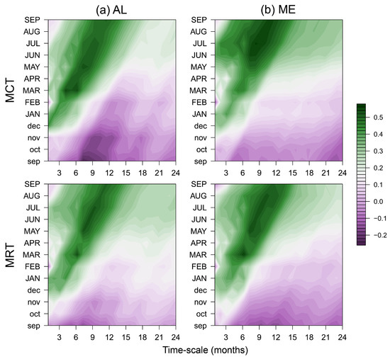Significant climate–RWI correlations were more frequent for precipitation than temperature variables (Figure S2). In the site ME, MCTs responded more to May–July precipitation than MRTs. June and July Tmax had negative effects on the RWI of trees in ME, whereas April Tmin showed a consistent positive effect on growth at both sites. Previous winter, spring, and early summer precipitation presented positive correlations with RWI at both sites (Figure S2). Consistently, we found that the strongest correlations between RWI and the drought index were found with March SPEI calculated at a 6-month-long scale (SPEI6.March: AL: rMCT = 0.543, rMRT = 0.539; ME: rMCT = 0.449, rMRT = 0.559) and with July SPEI calculated at a 9-month scale (SPEI9.July: AL: rMCT = 0.519, rMRT = 0.530; ME: rMCT = 0.556, rMRT = 0.538) (Figure 3). These results highlight the importance of soil moisture during the previous fall and winter and current spring and early summer on growth variability.