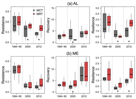 Resistance, recovery, and resilience against 1994–1995 (before mistletoe removal), 2005 and 2012 droughts (after mistletoe removal). Grey and red bars represent mistletoe-control trees (MCTs) and mistletoe-removed trees (MRTs), respectively. Significant differences (p < 0.05) between MCTs and MRTs, according to Kruskal–Wallis test, are indicated with asterisks.